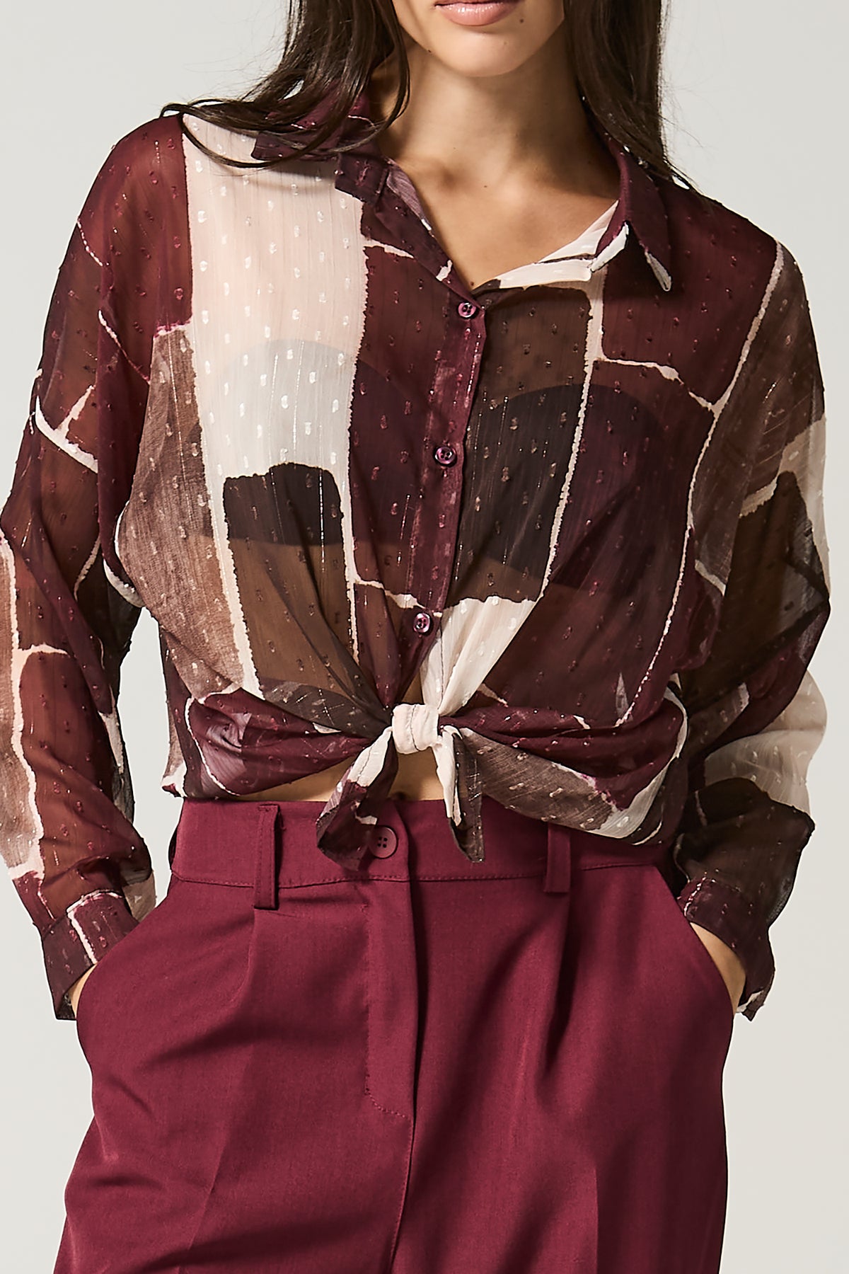 Camicia fantasia astratta multicolor, tessuto operato, manica lunga, polso a un bottone.