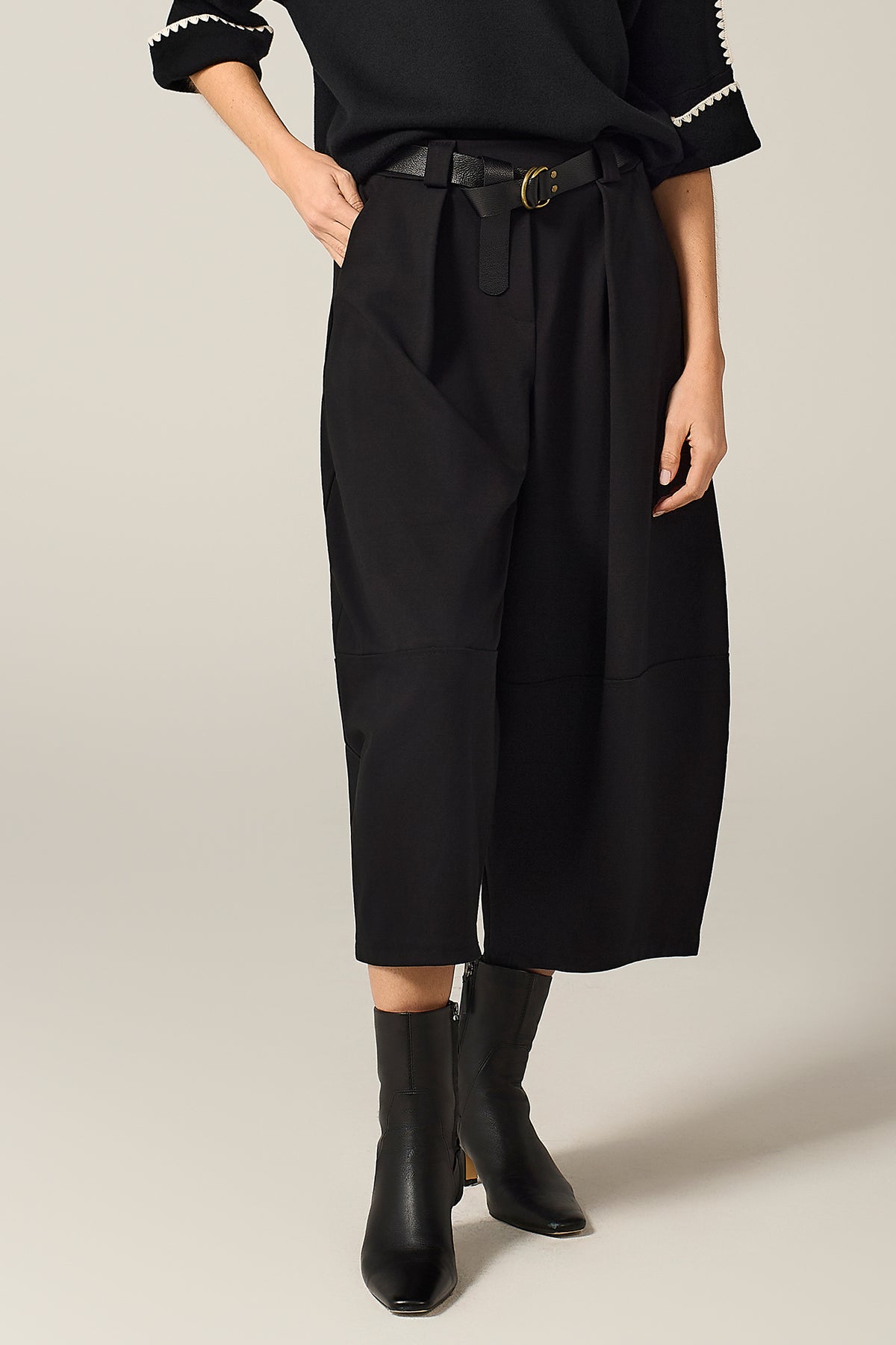 Pantalone balloon in punto milano stretch, pinces davanti, tasche laterali alla francese, elastico interno in vita, cinta in ecopelle.