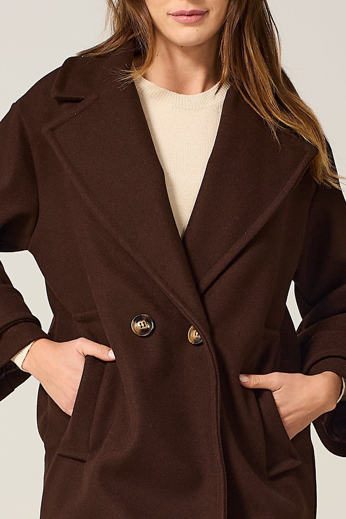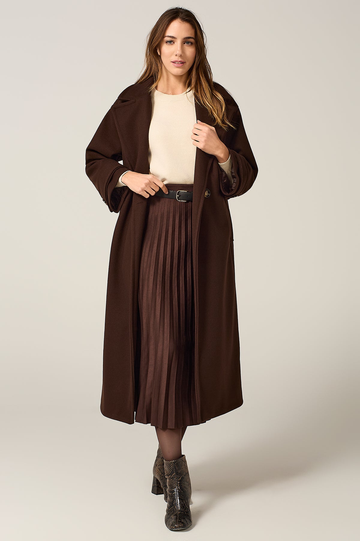 Cappotto lungo doppiopetto a due bottoni, revers ampio, tasche laterali a filetto, pattina con bottone ai polsi.