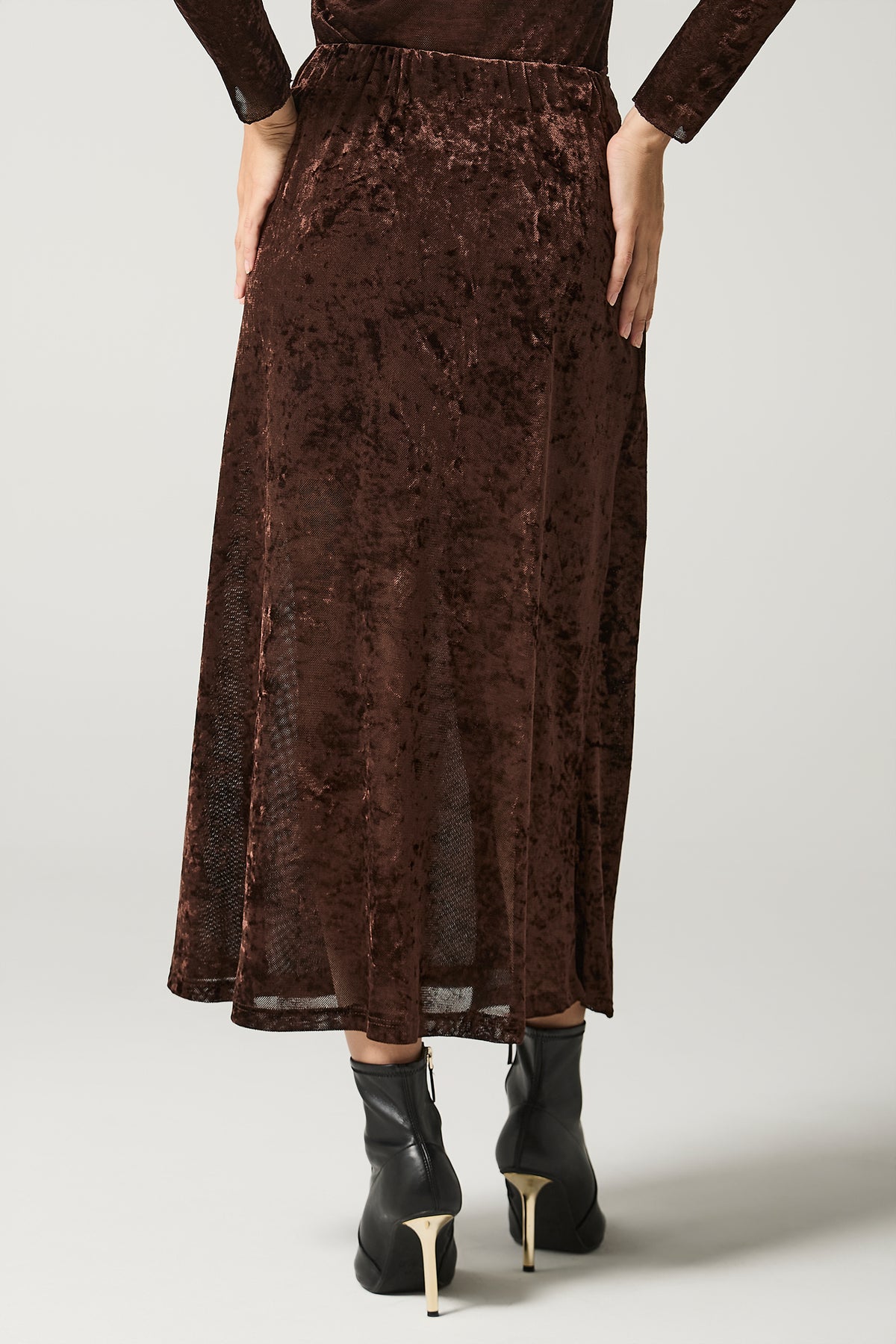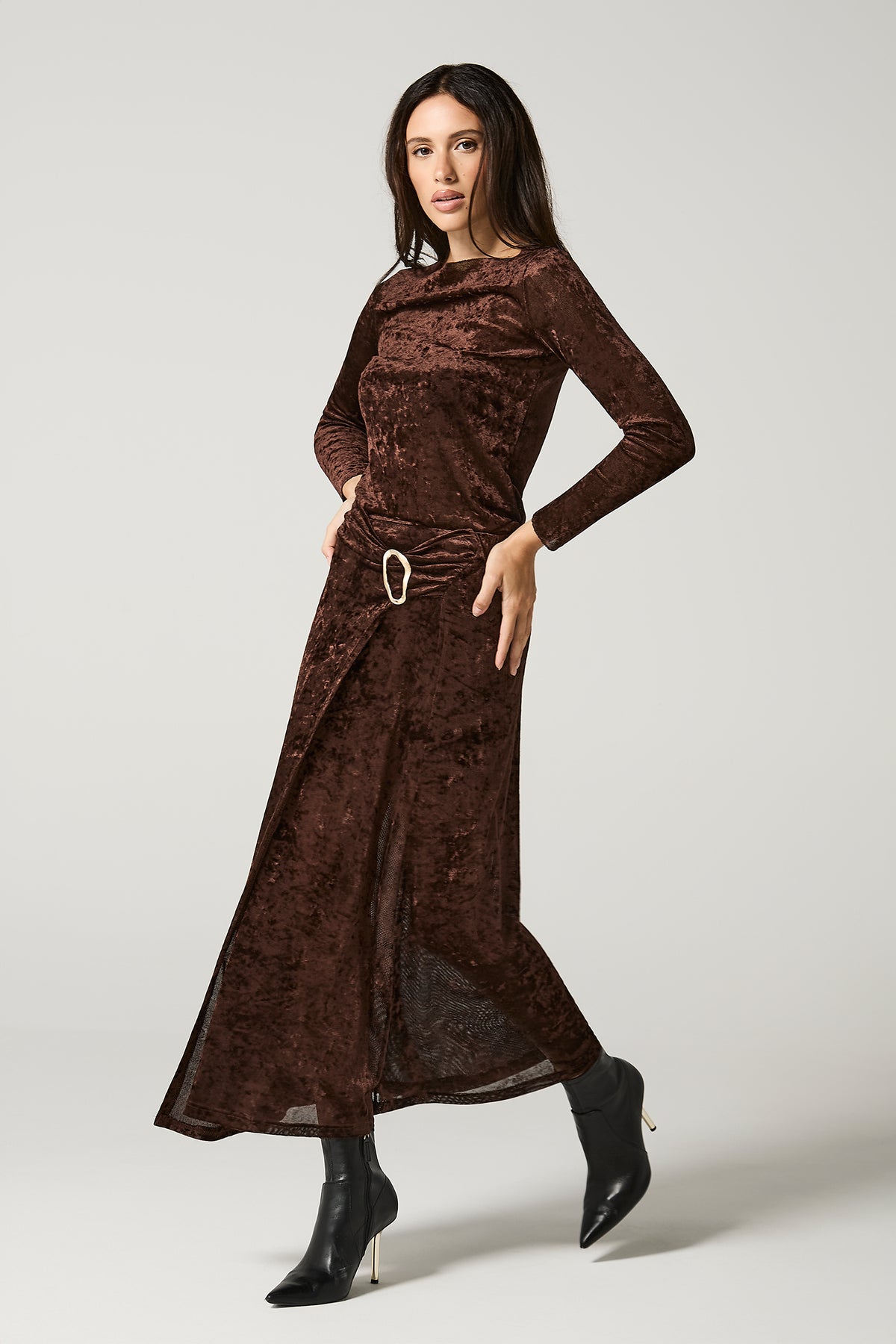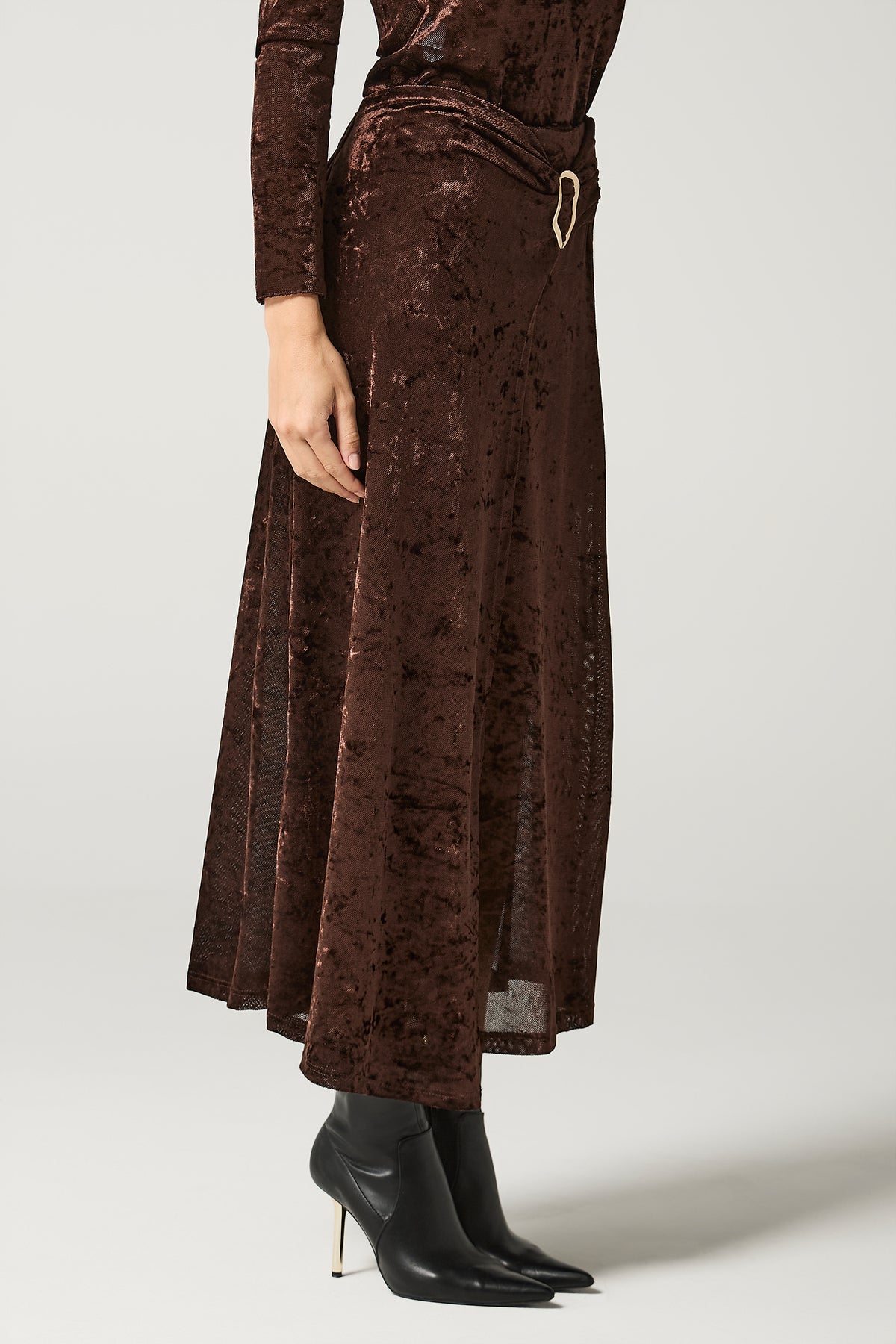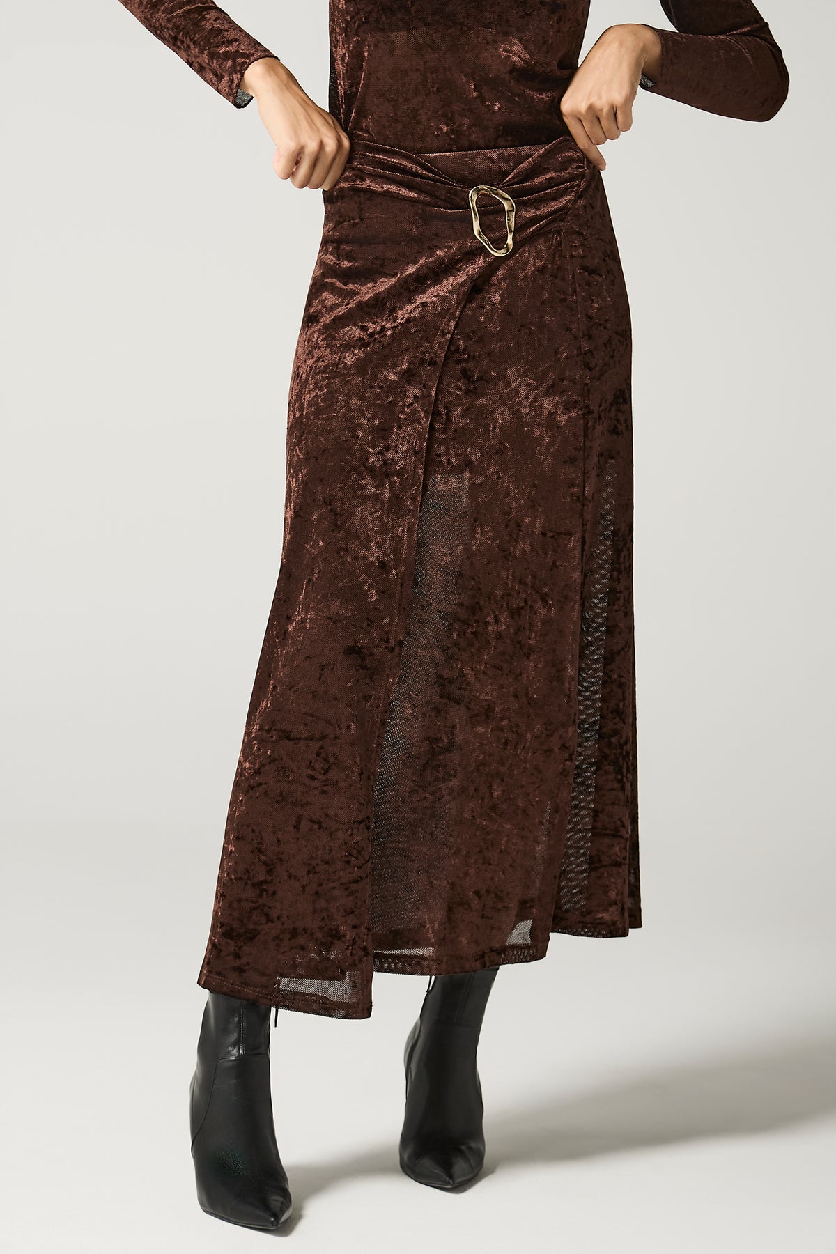 Gonna midi in ciniglia stretch, incrocio davanti con fibbia metalliaca oro, apertura laterale, elastico interno in vita.