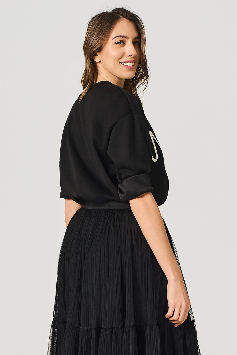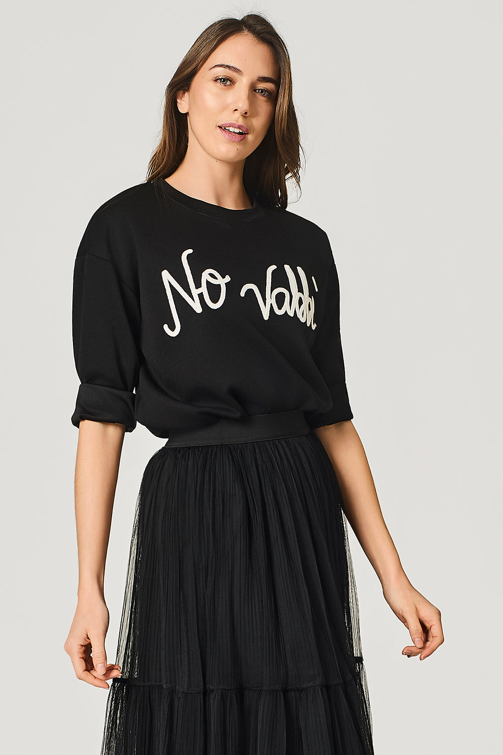 Felpa leggera in viscosa stretch, girocollo, scritta ricamata "No vabbè", manica lunga.