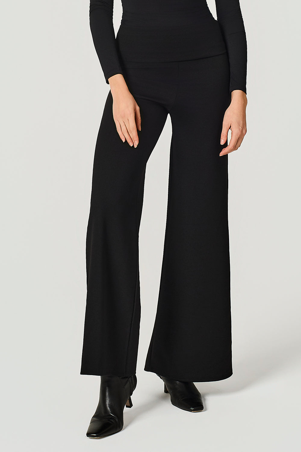 Pantalone in viscosa stretch, vita con bordo alto risvoltato, gamba larga al fondo.