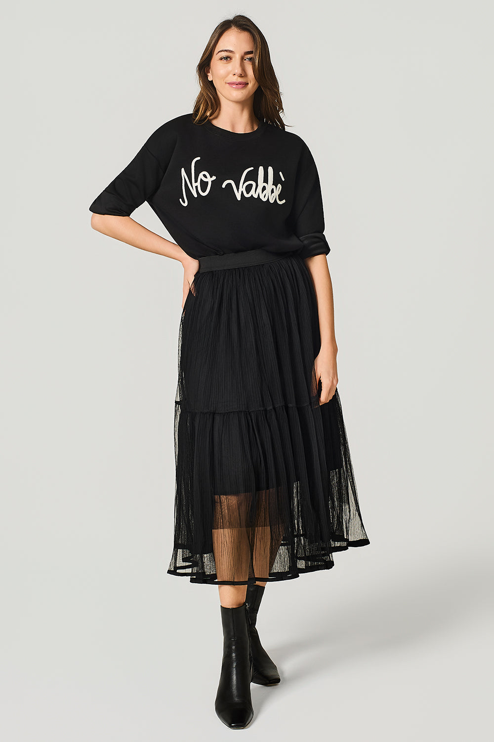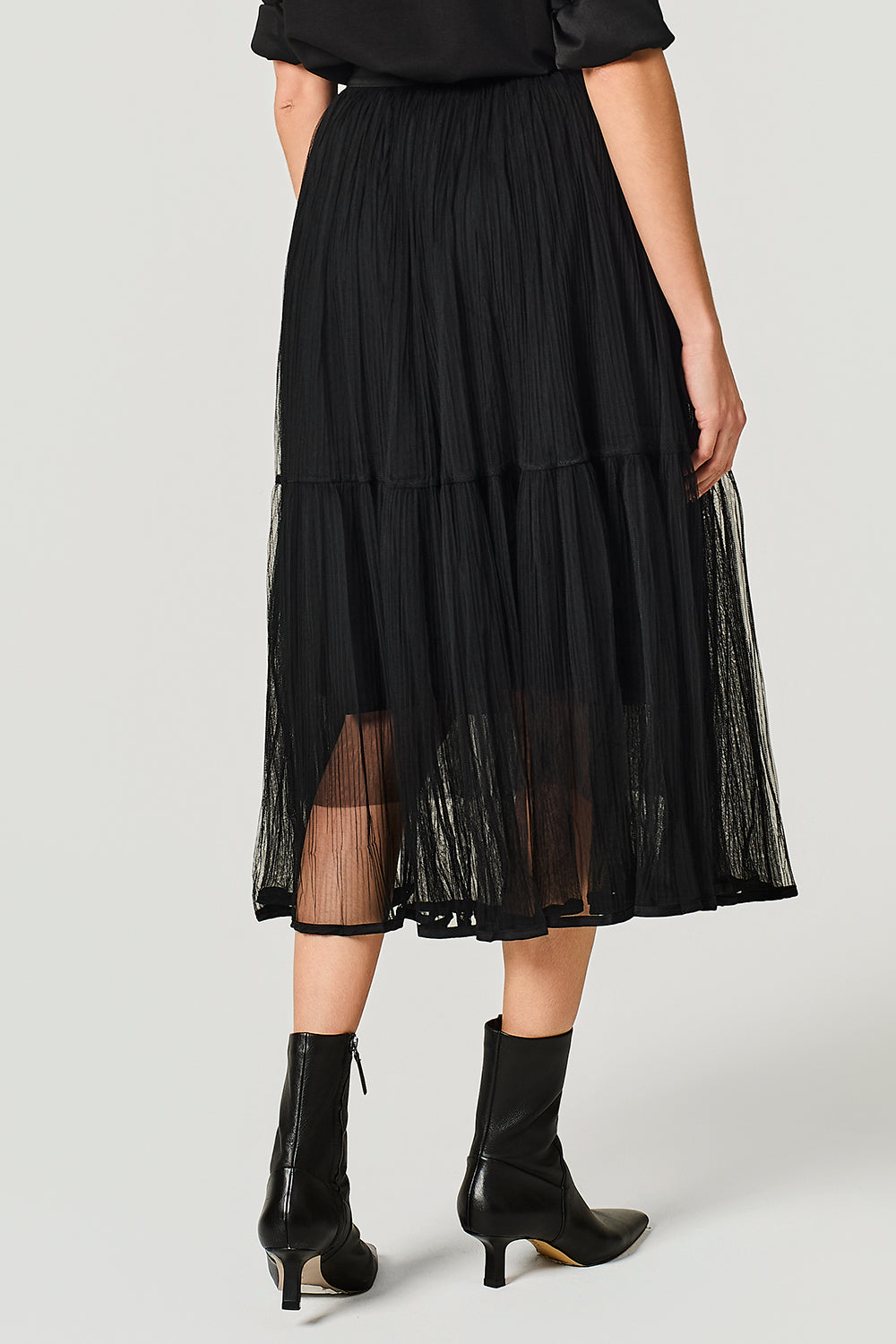 Gonna ampia in tulle plissè, fodera in viscosa stretch, bordino in raso al fondo.