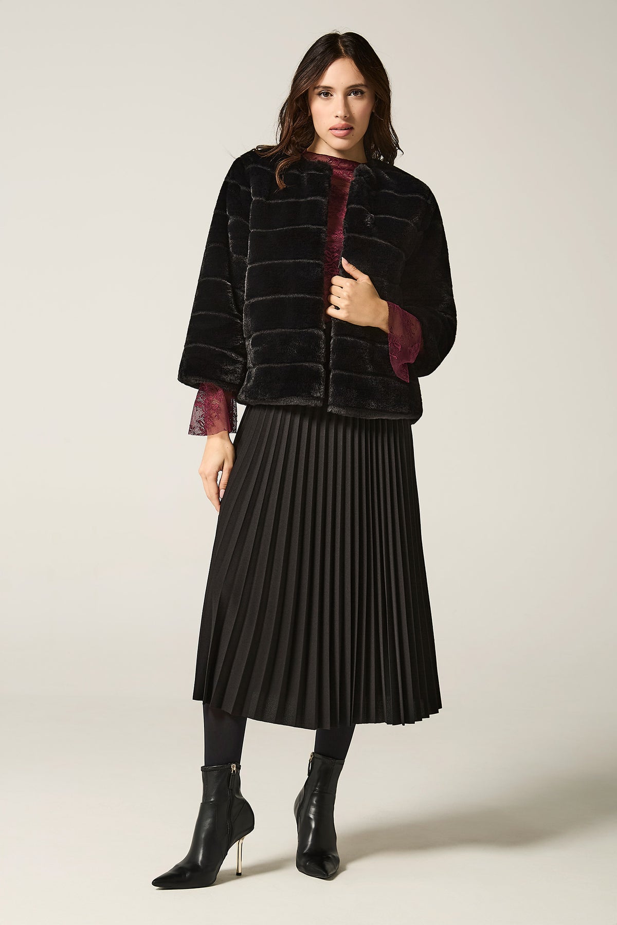 Gonna lunga plissè con cinta foderata in vita, elastico interno in vita.