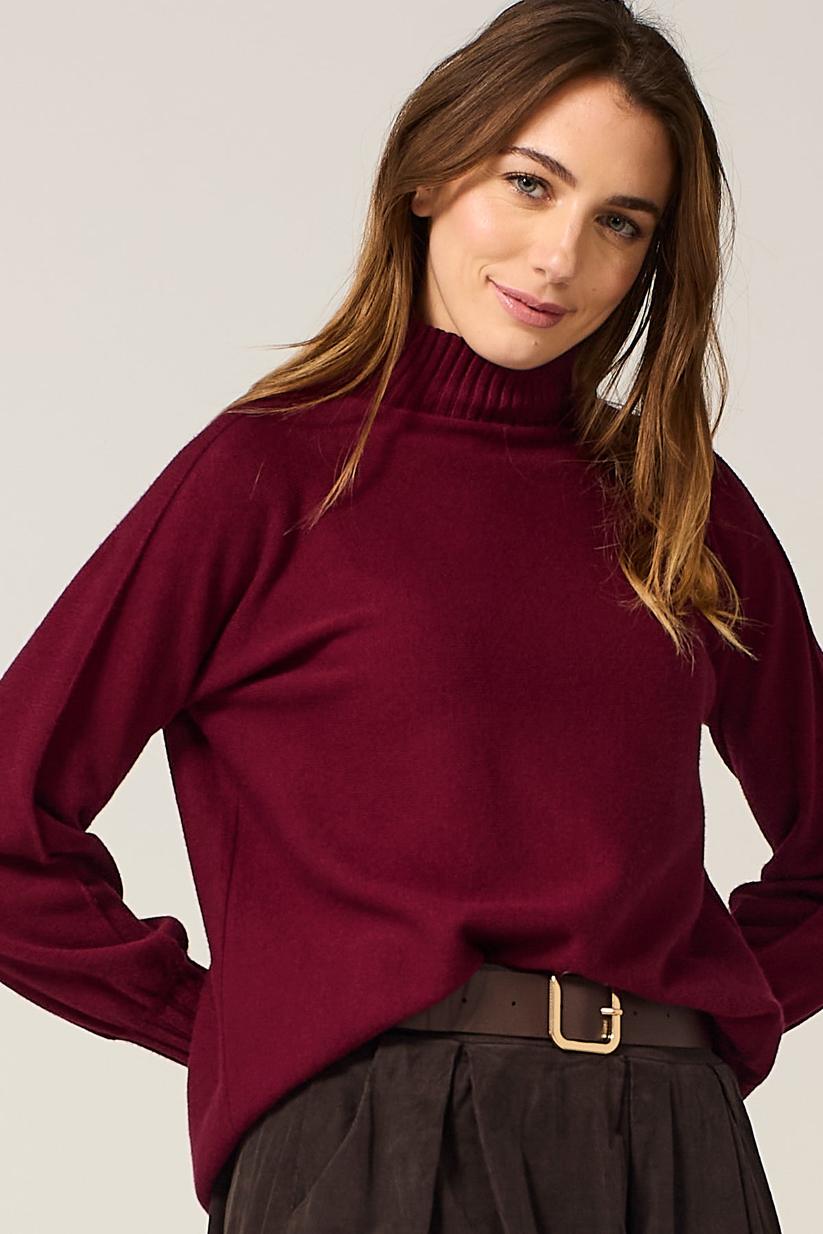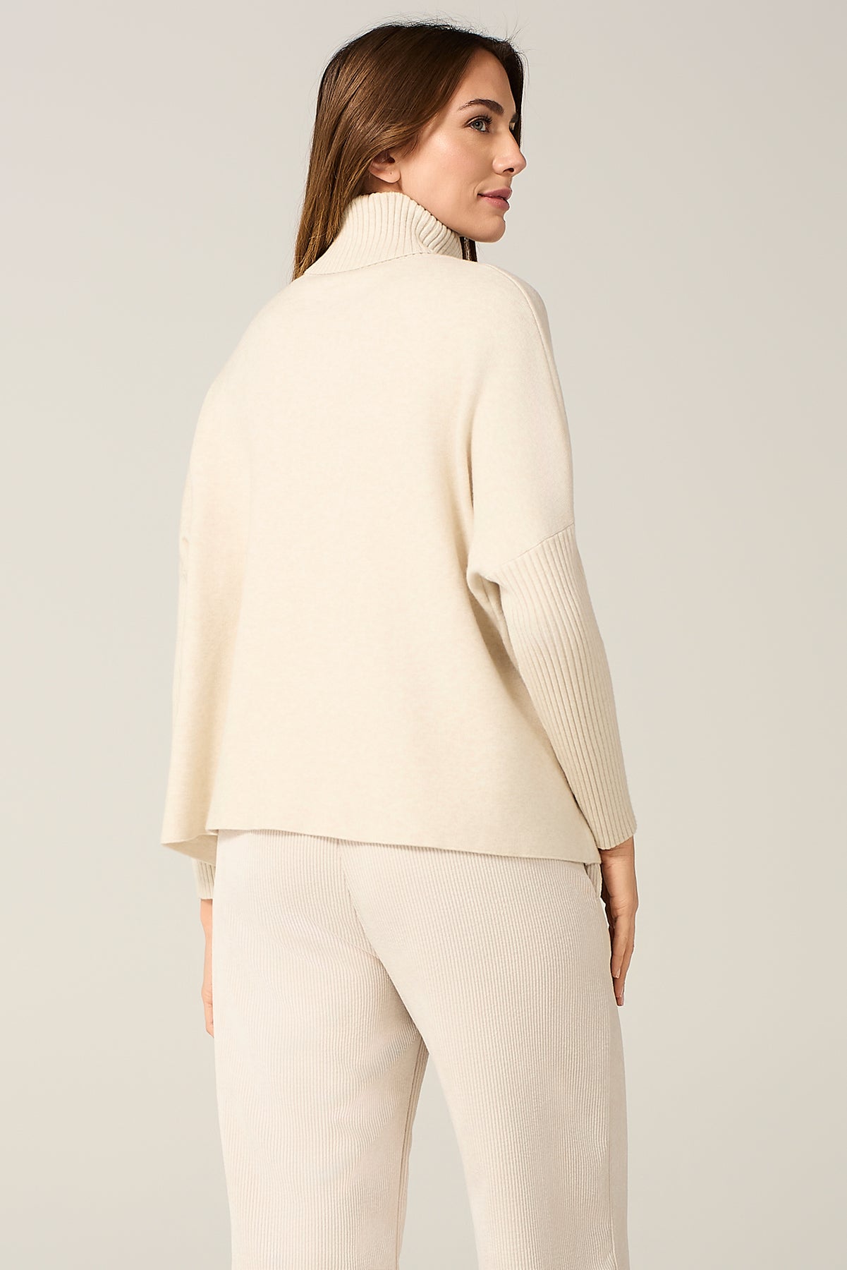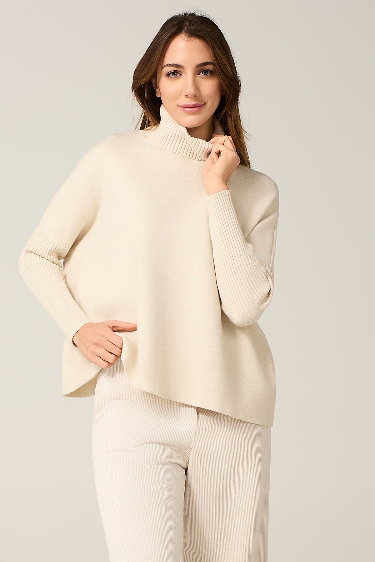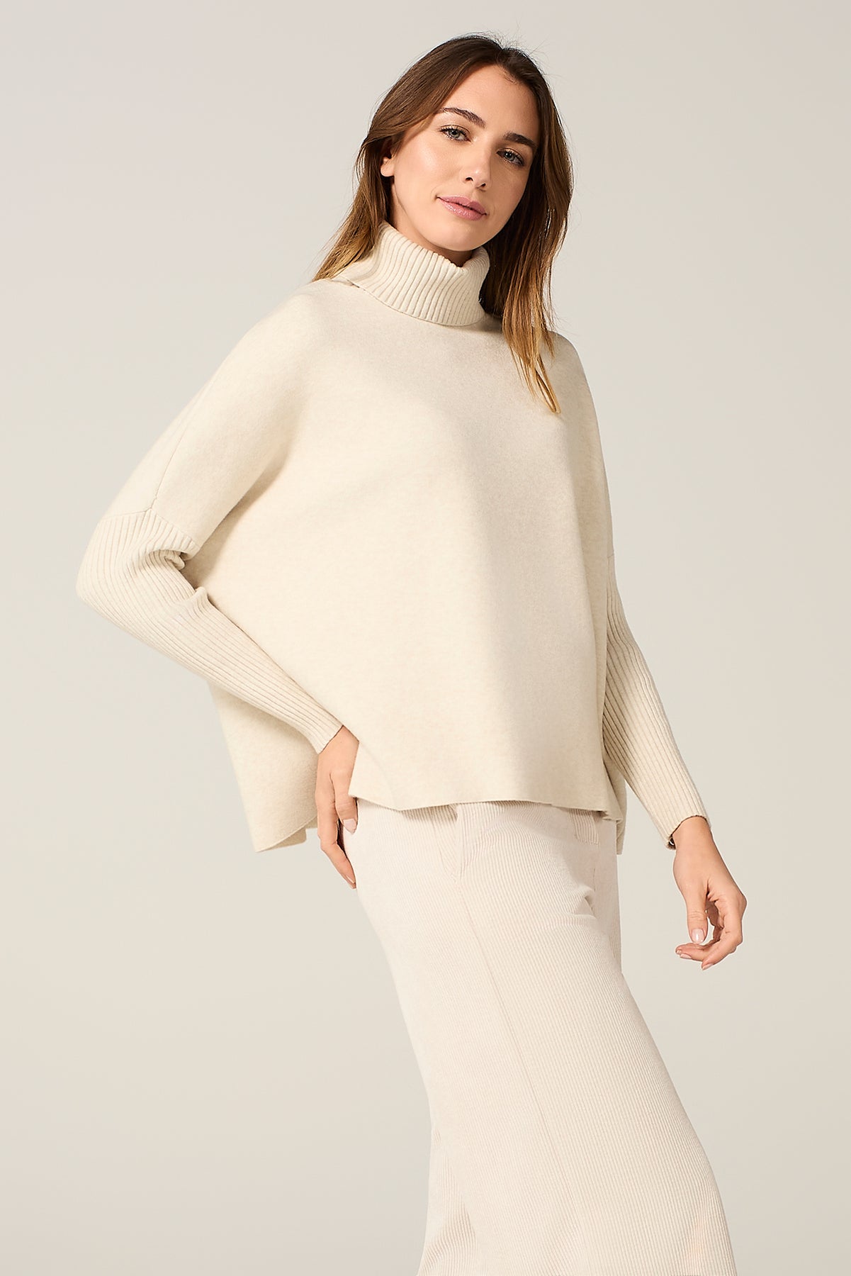 Maglia collo a lupetto, giromanica sceso, costa al collo e ai polsi, fondo ampio.