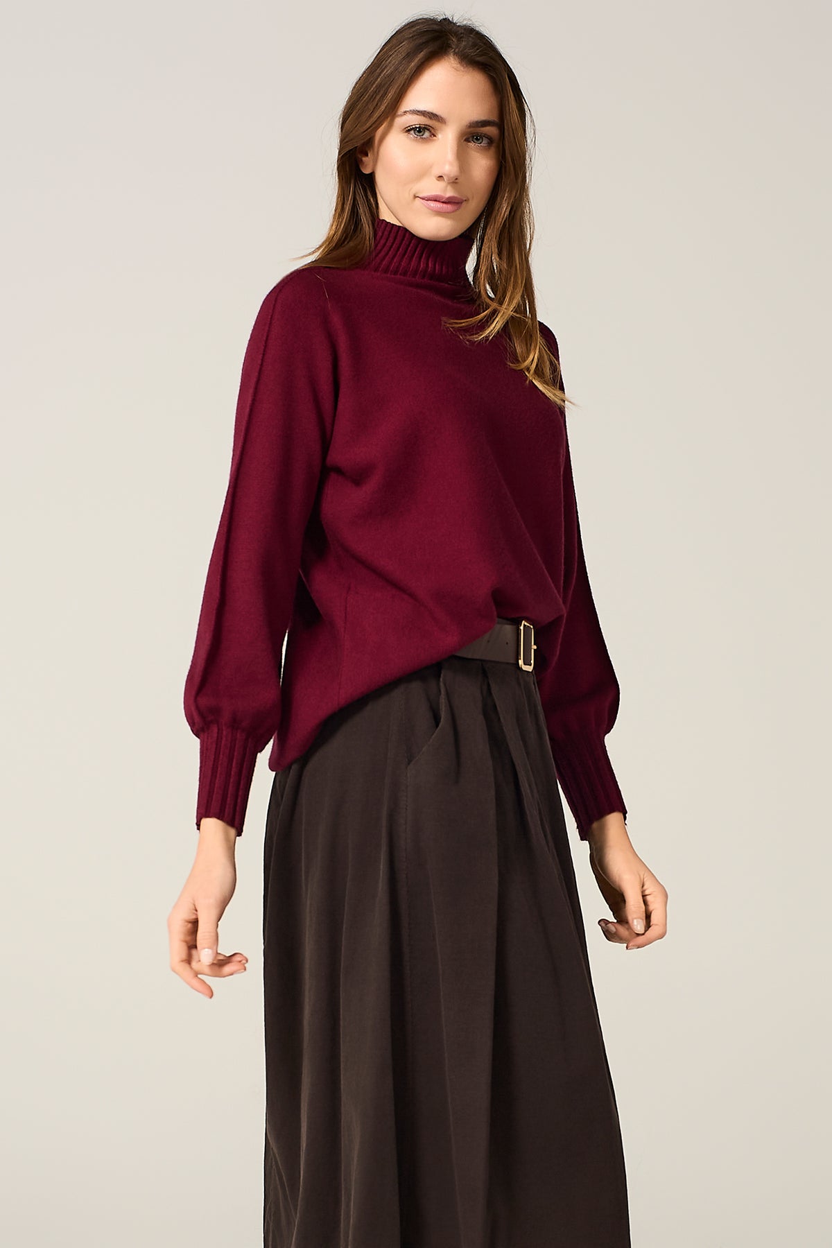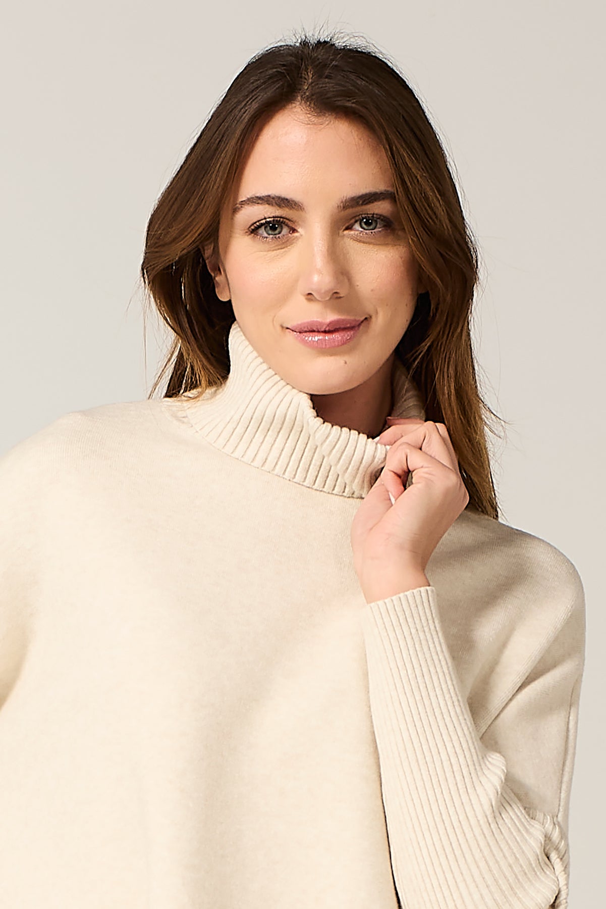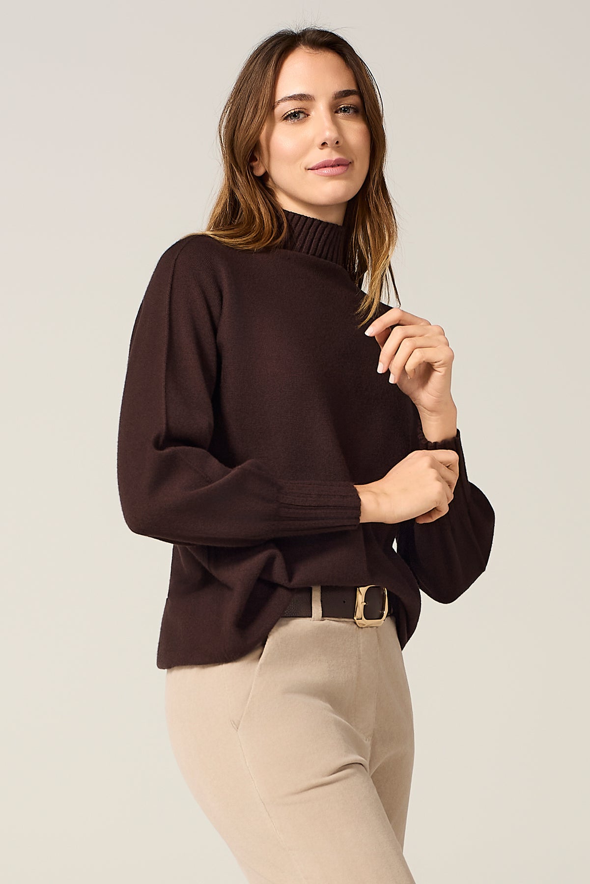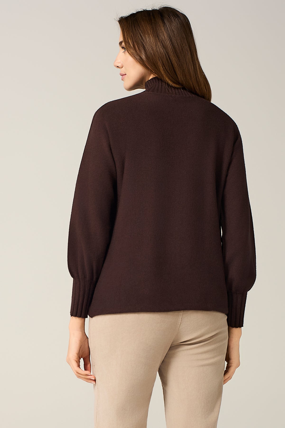 Maglia collo a lupetto, giromanica sceso, costa al collo e ai polsi, fondo ampio.