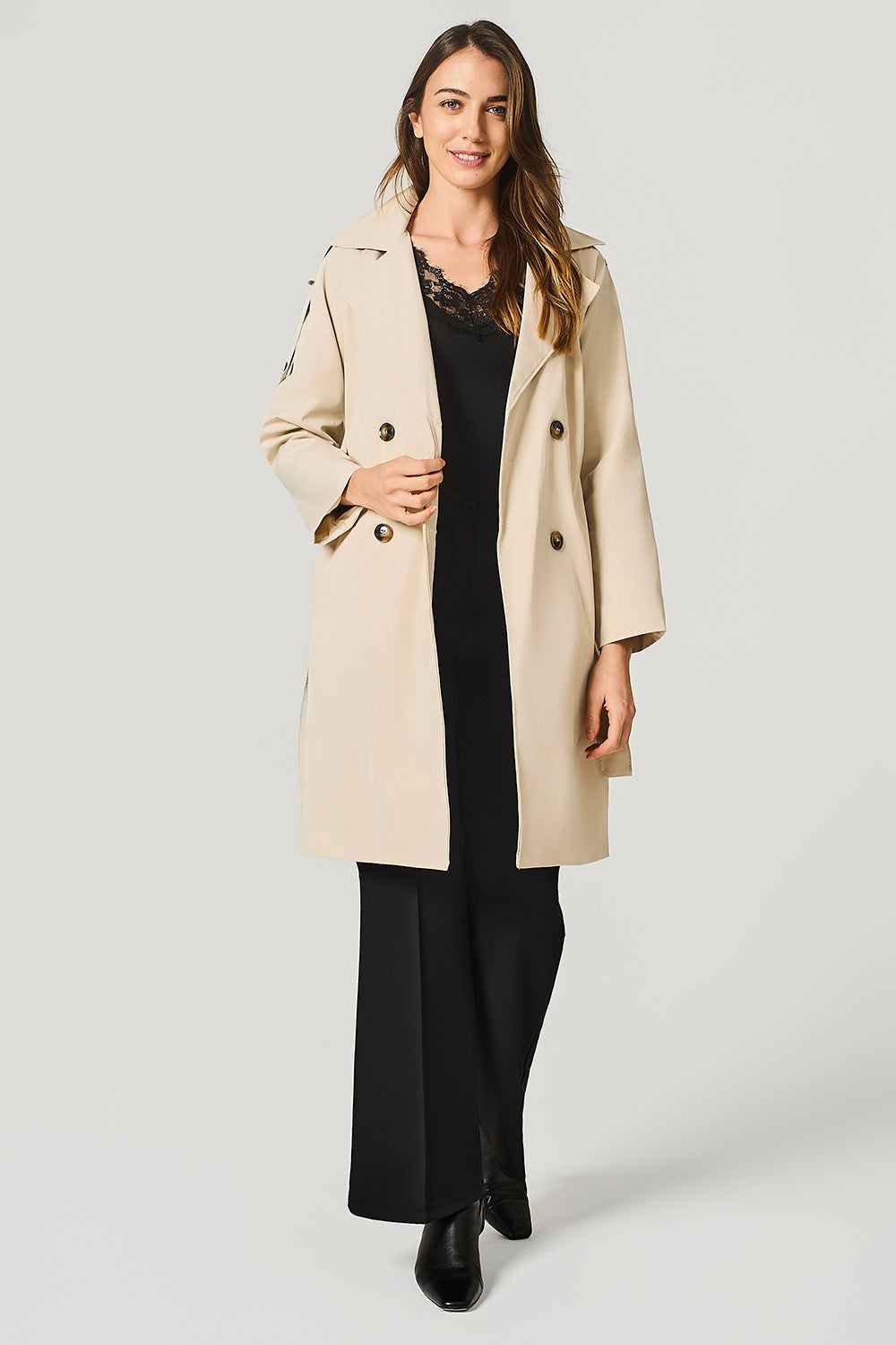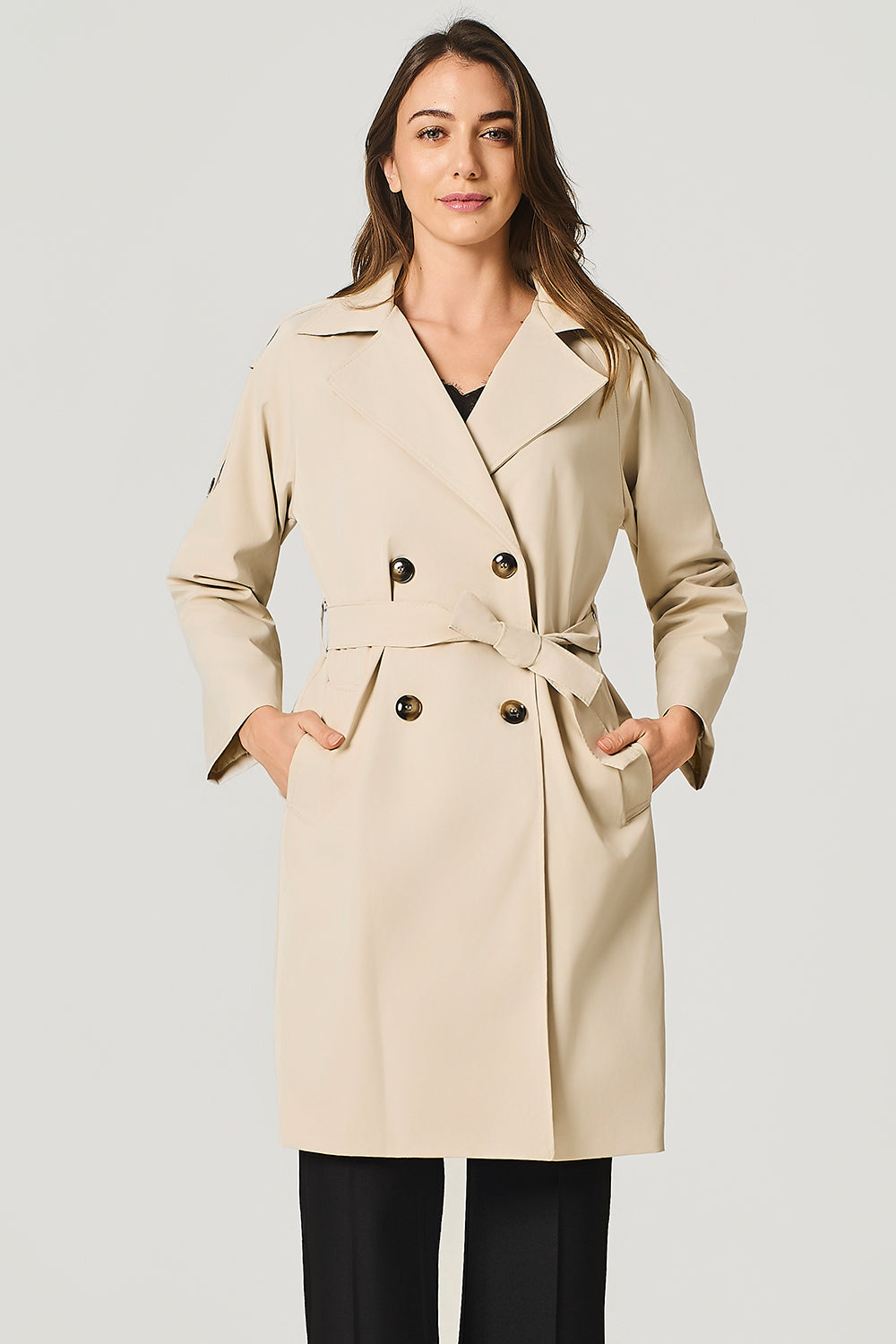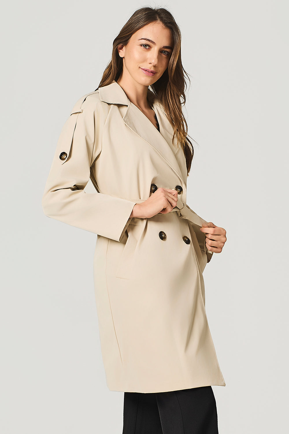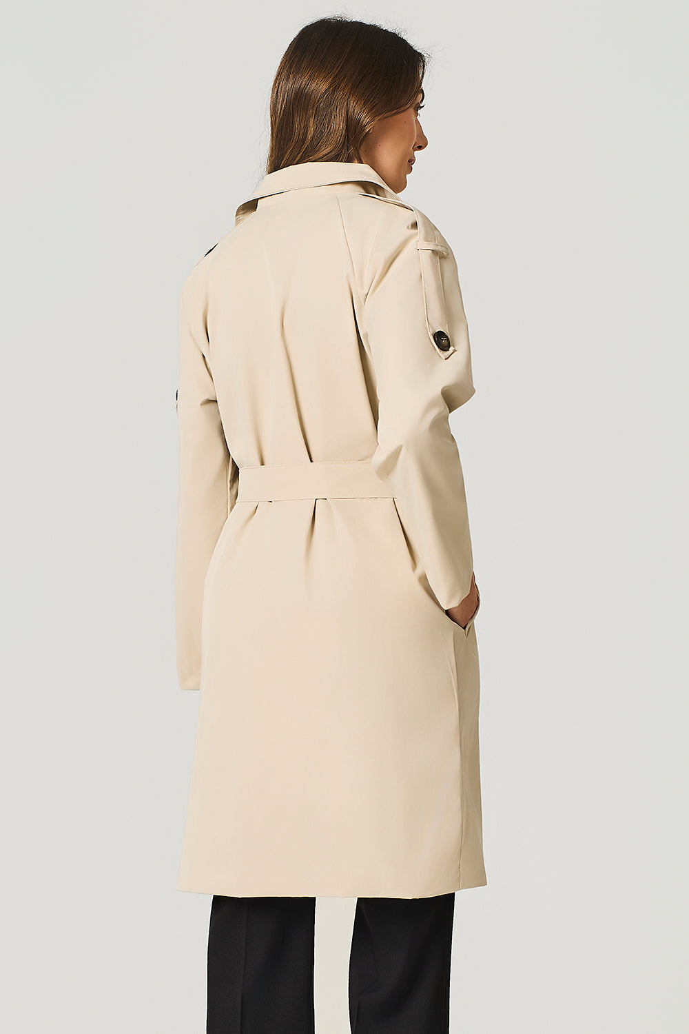 Trench doppiopetto, revers ampio, cinta a fusciacca in vita, tasche laterali a filetto..