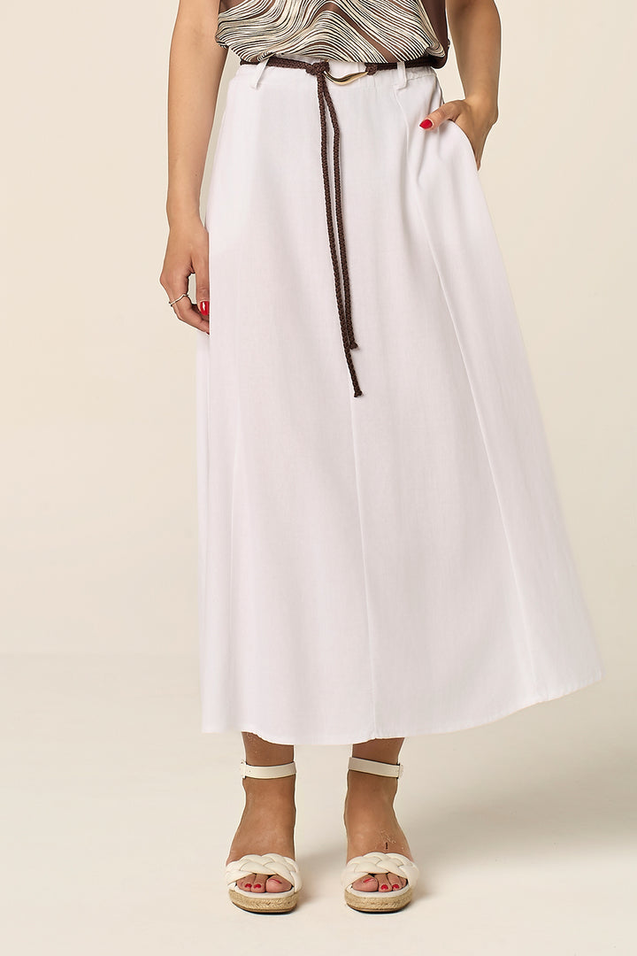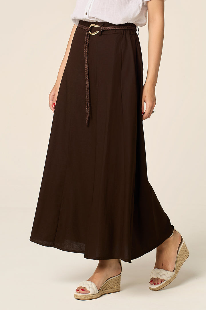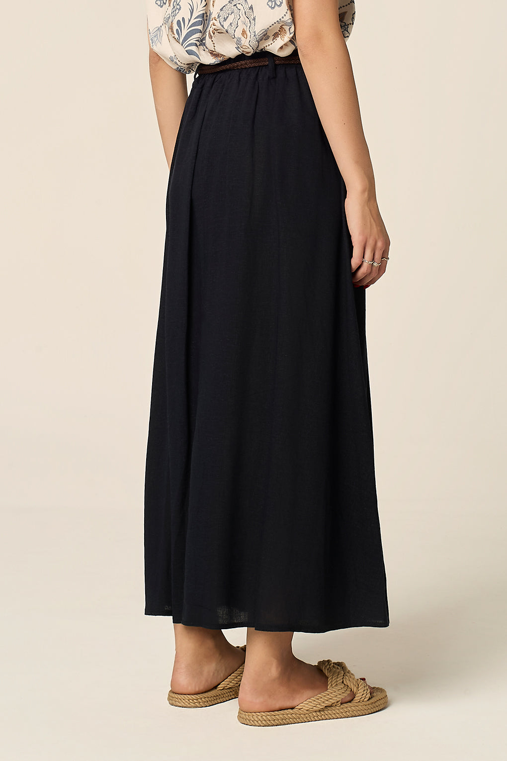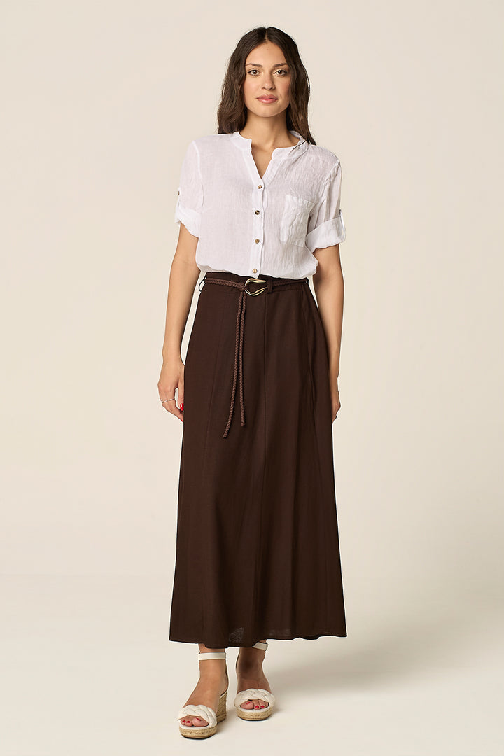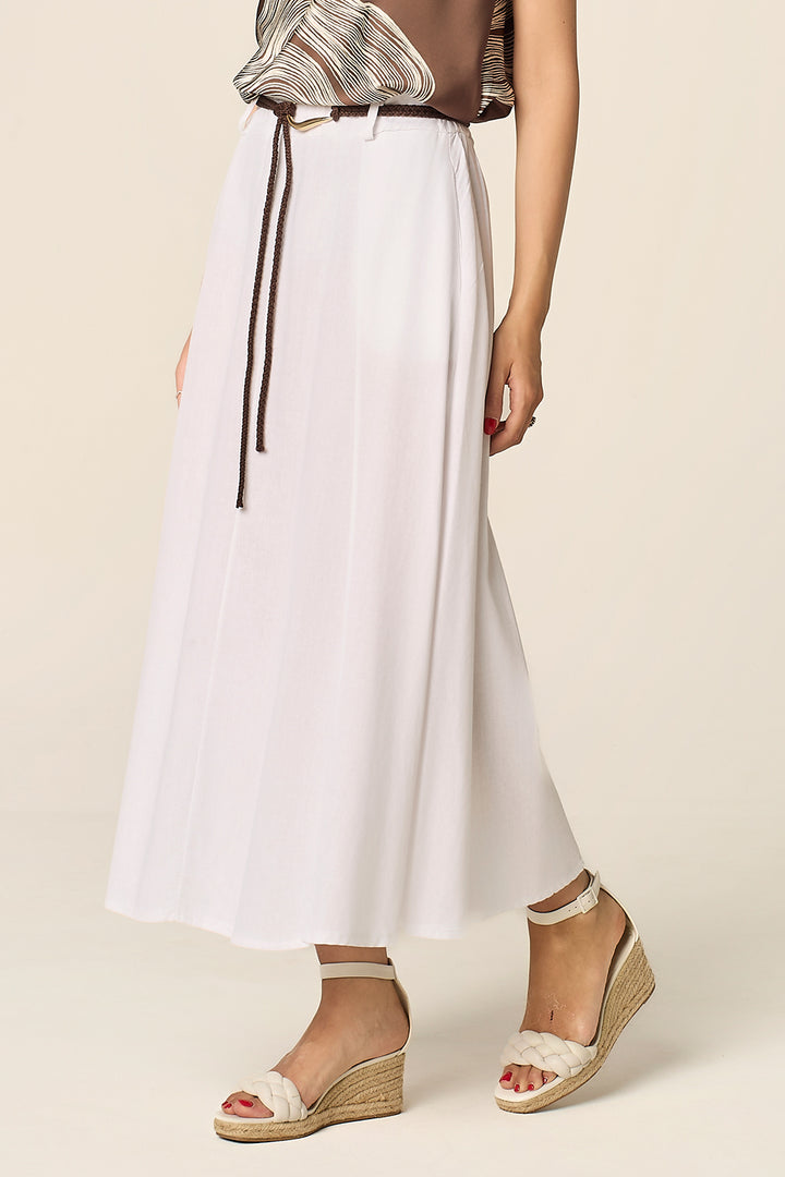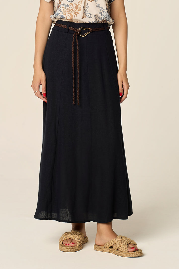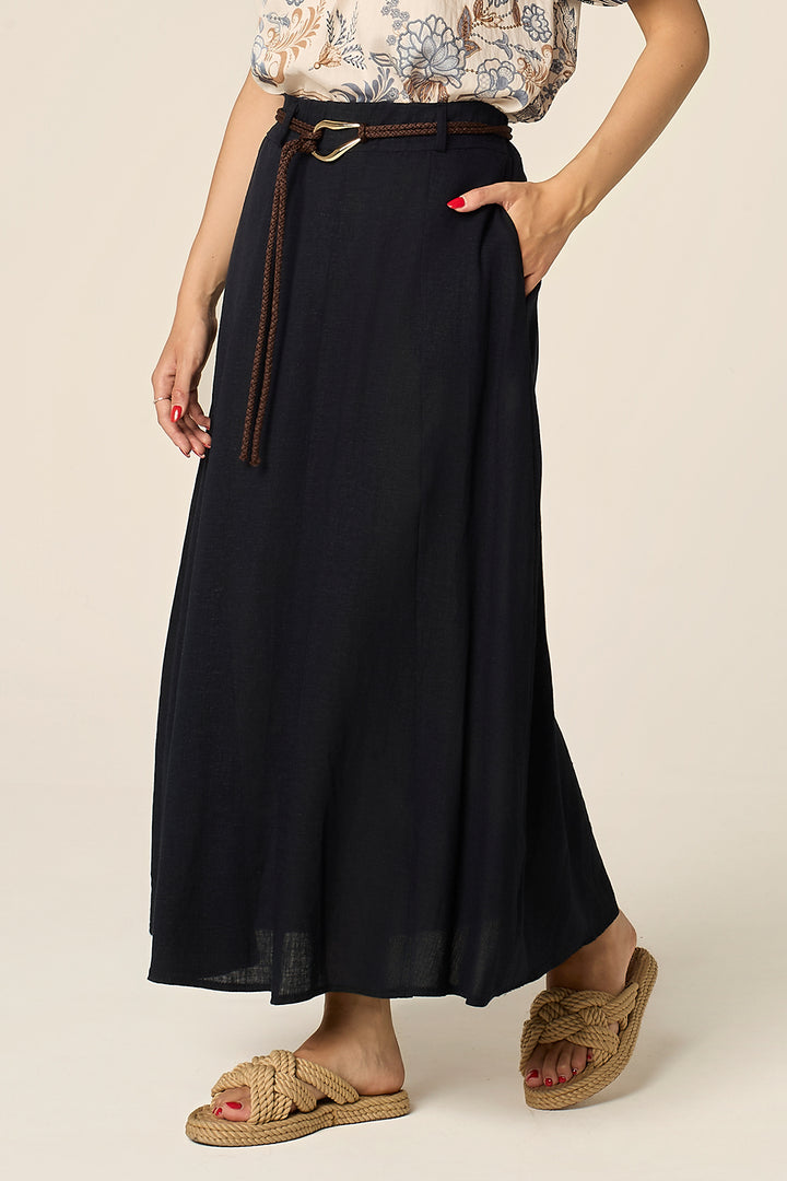 Gonna lunga in lino viscosa, elastico interno in vita, cinta in corda.