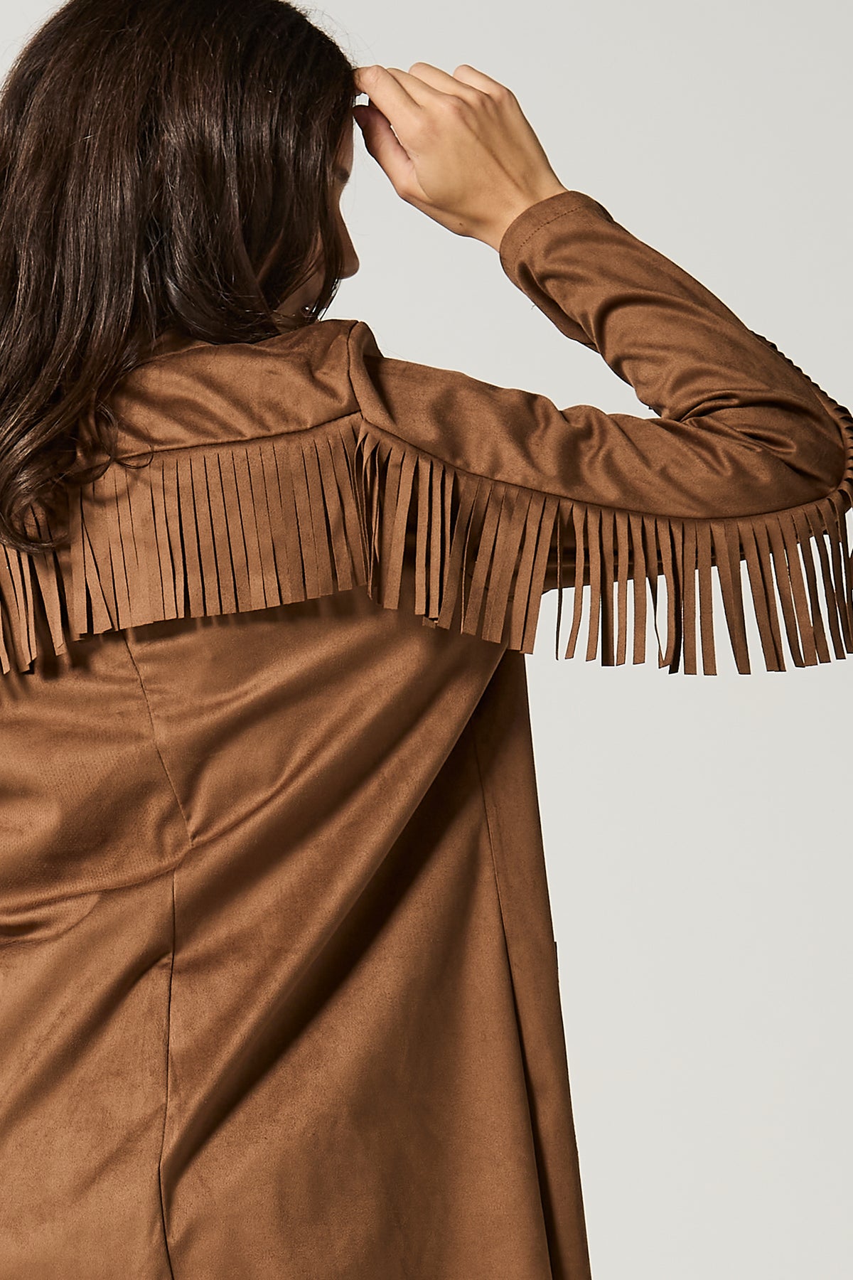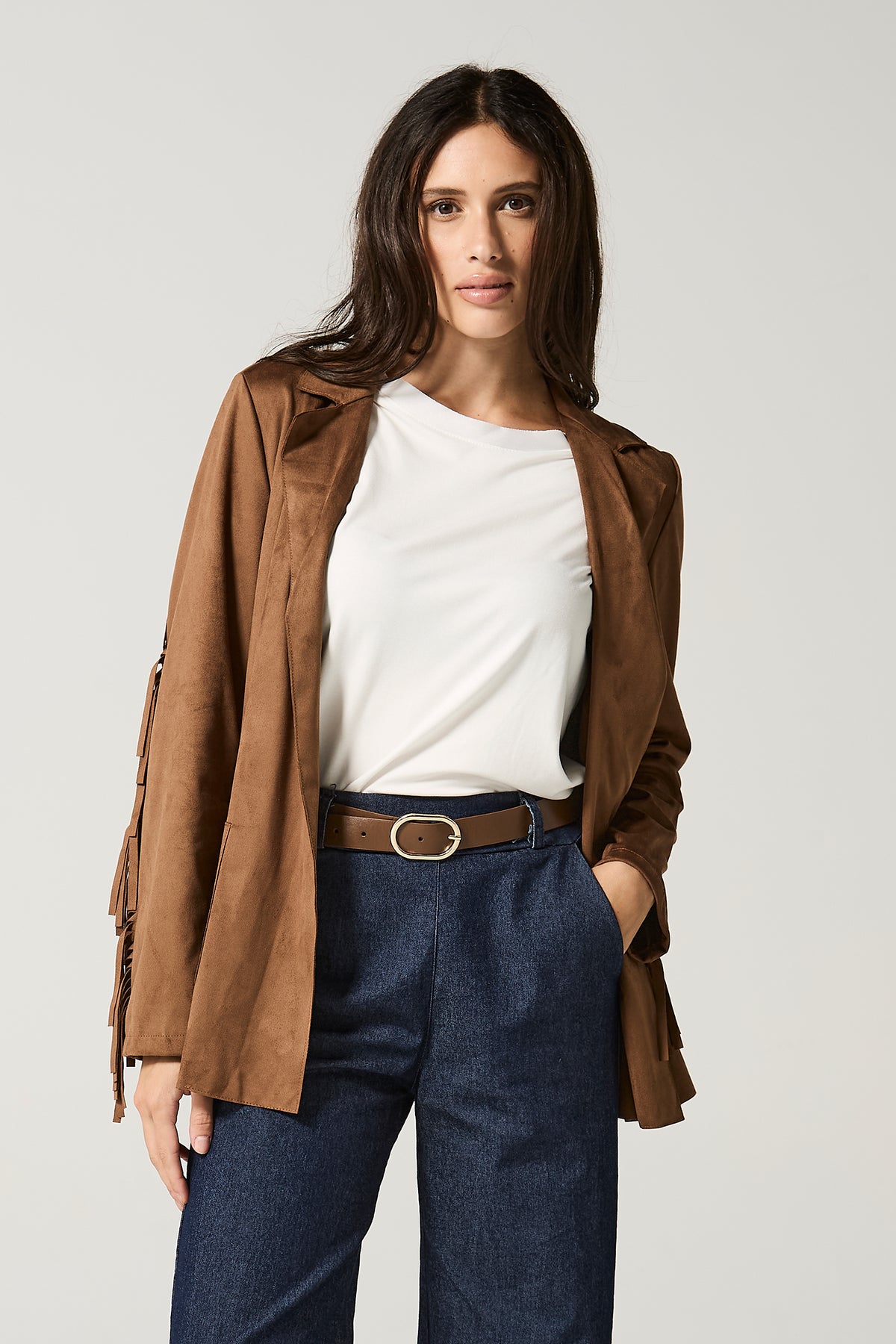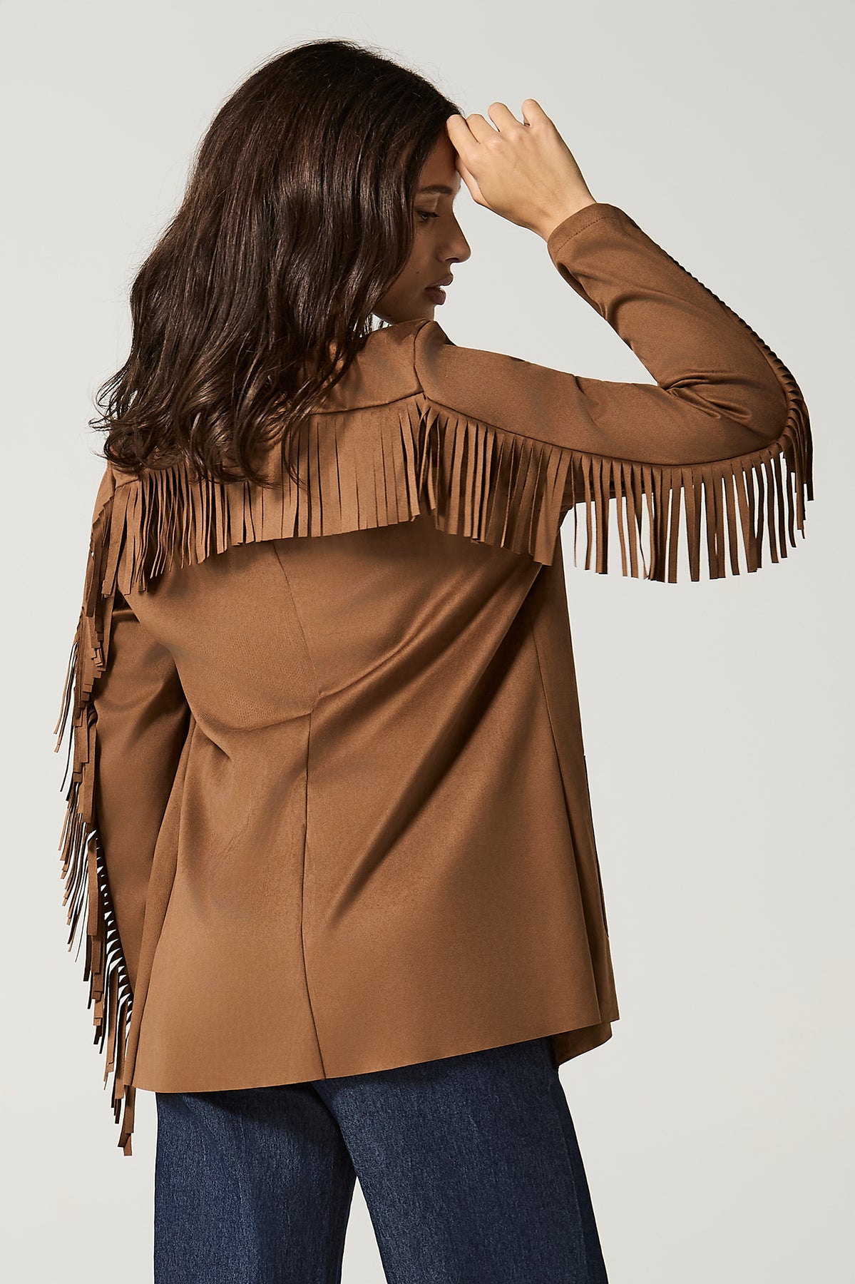 Giacca aperta in dainetto con frange.