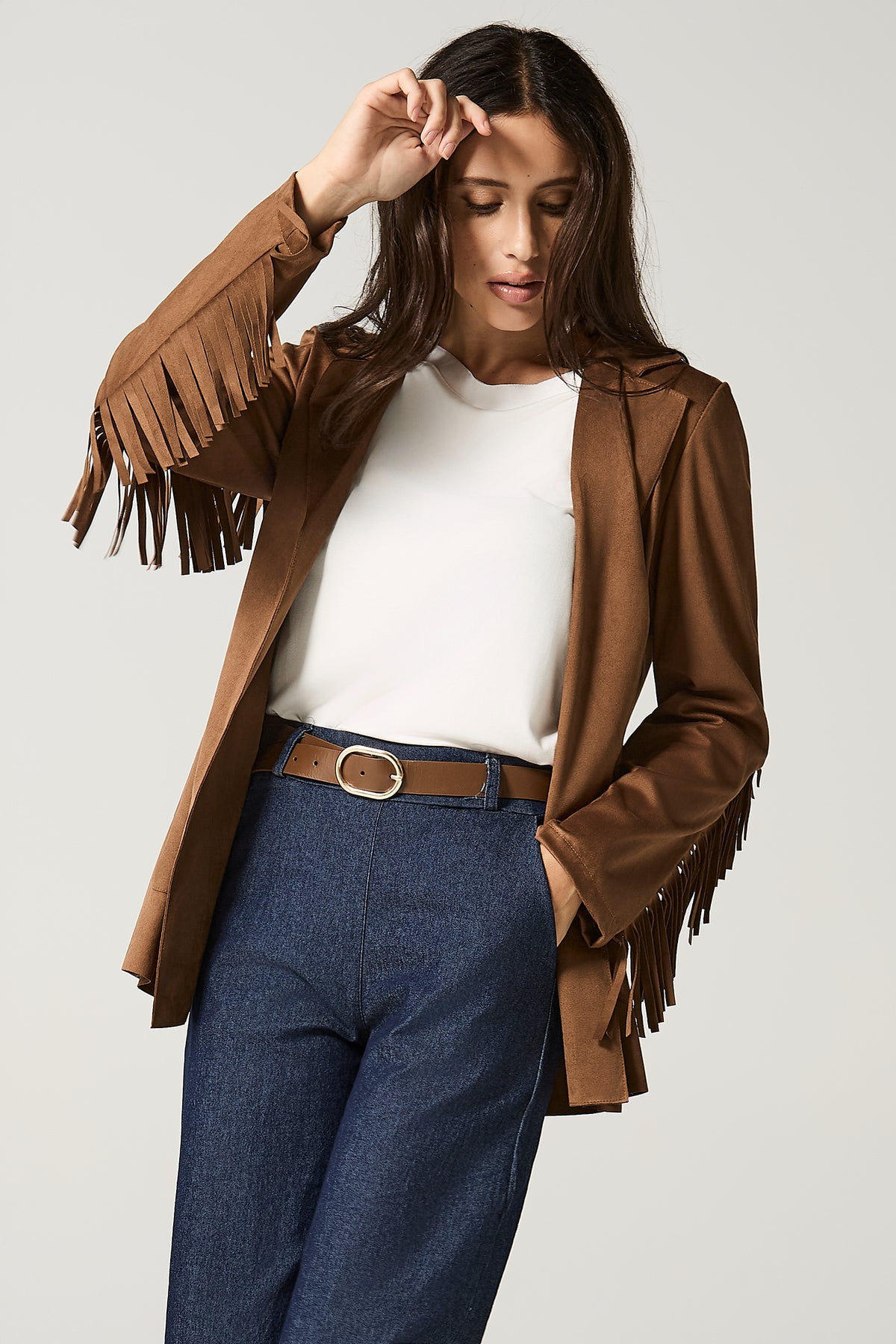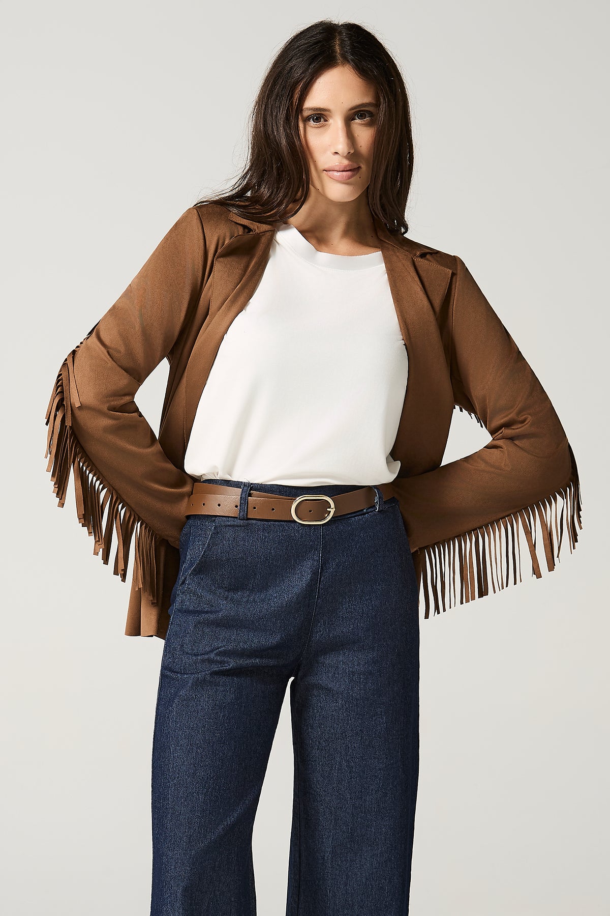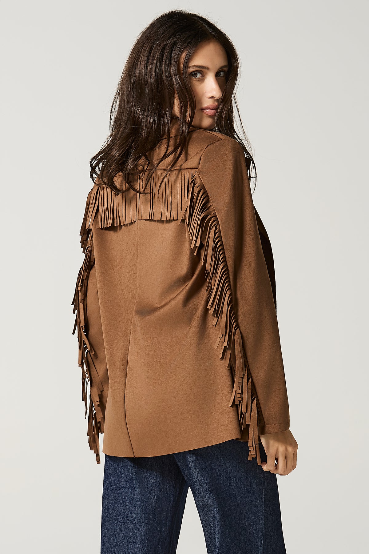 Giacca aperta in dainetto con frange.